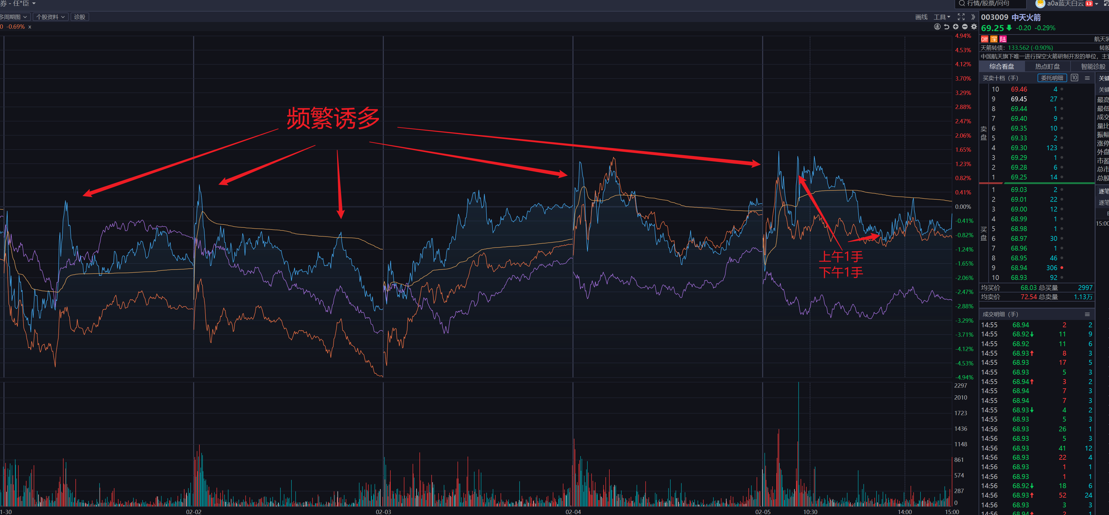 这几天大盘体感不好。不应该上午十点以前买入股票,虽然说强股一般是十点前就涨停了,但是这几天大盘比较弱,随时有掉头向下的可能,应该谨慎一些。下午抄底博反弹,或者干脆不动。今天又冲动了。平谭发展上午卖飞了,上午主力净额广东房产类的排名第一的。也是它涨的有些快,没来得及看。昨天买的股卖的位置还算正确。但是下午的华鑫股份和光启技术是不应该买的,光启技术也是要博明天反弹。机会不大。华鑫股份纯粹是扯蛋,虽说只有1手。那也是万万不该的。中天火箭不该上午买,结果套牢了一下。明天看情况出吧。尾盘竞价扬了一小下,不知道为什么。复旦微电虽说网上对上年第四季度的业绩估值为亏损,但是它这阵子一直横盘,不清楚为什么,也没有套牢大批人的意思。就是慢慢向下,回升的比一般股还快,不知道为什么。